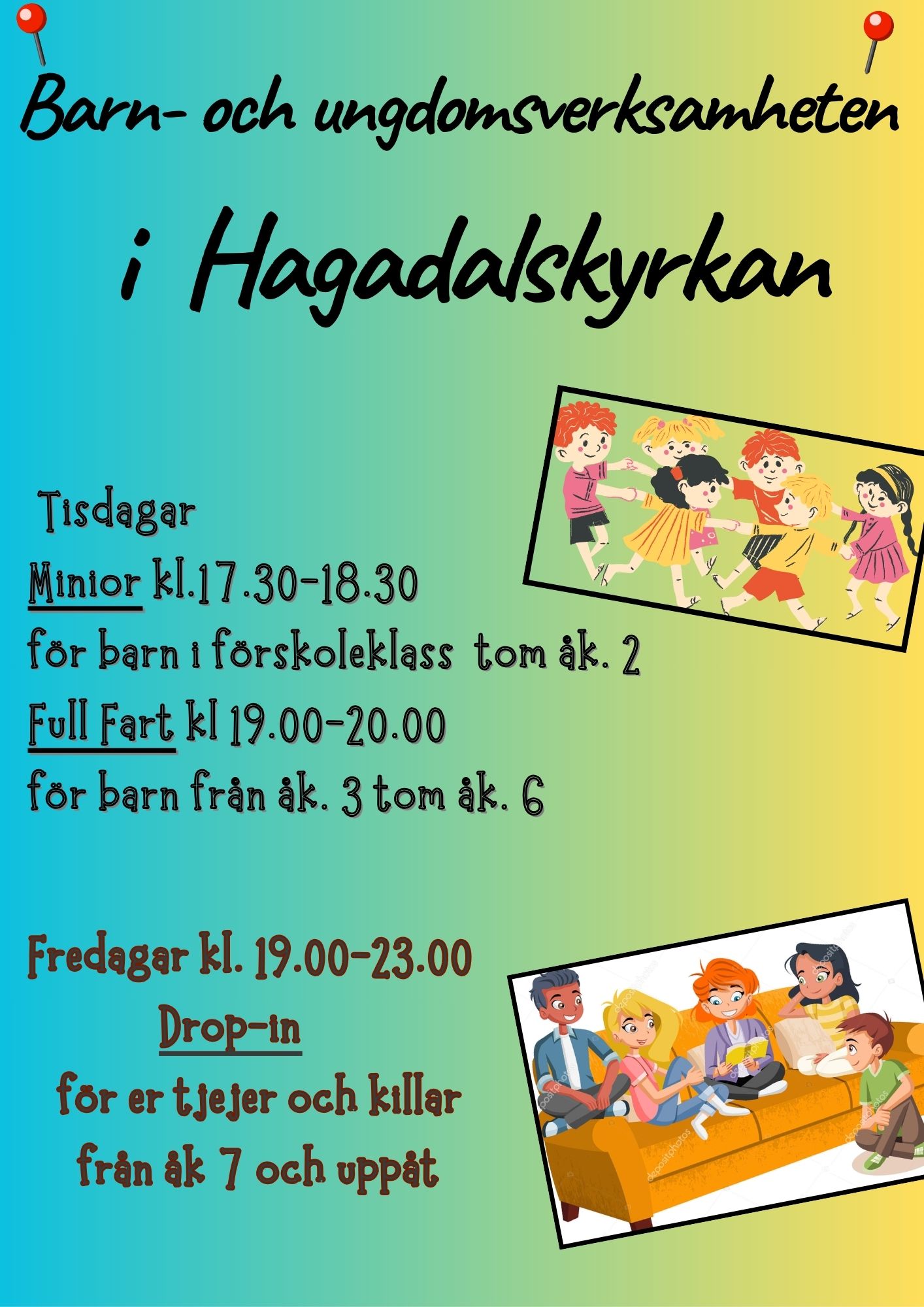 Vi håller mestadels till i Hagadalskyrkan som ligger mitt i samhället, men sommartid förläggs verksamheten till vårt sommarställe Västragård.